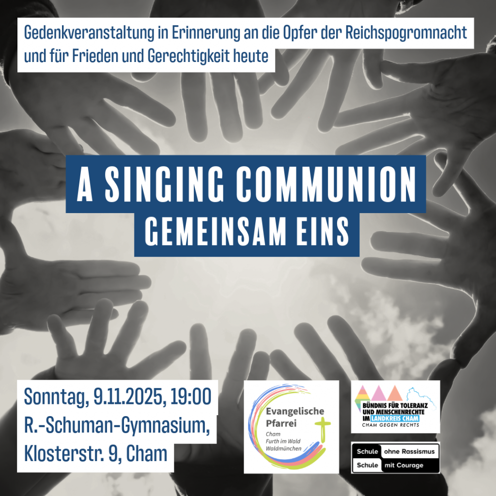 Veranstaltung im Gedenken der Opfer der ReichspogromnachtLieder, Gedichte und Gebete aus der jüdischen und christlichen Tradition Am Sonntag, den 9. November 2025, laden die Pfarrei Cham, Furth im Wald, Waldmünchen und das Bündnis für Toleranz und Menschenrechte im Landkreis Cham / Cham gegen Rechts zu einer besonderen Gedenkveranstaltung ein. Unter dem Titel „Singing Communion –…